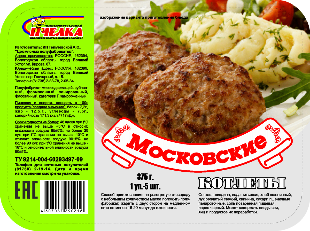 Состав: говядина, хлеб пшеничный, лук репчатый, сухари панировочные, соль, перец черный молотый.